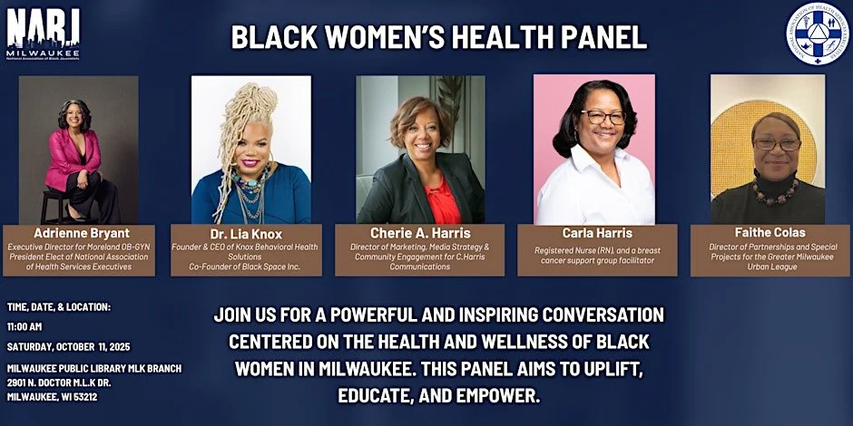 Moderated by Faithe Colas of the Greater Milwaukee Urban League, the event will feature Dr. Lia Knox of Knox Behavioral Health Solutions, Cherie Harris of C.Harris Communications, and Carla Harris, R.N., a breast cancer support group facilitator. Together, they’ll create a space for truth-telling and strategy—where the focus isn’t survival, but thriving.